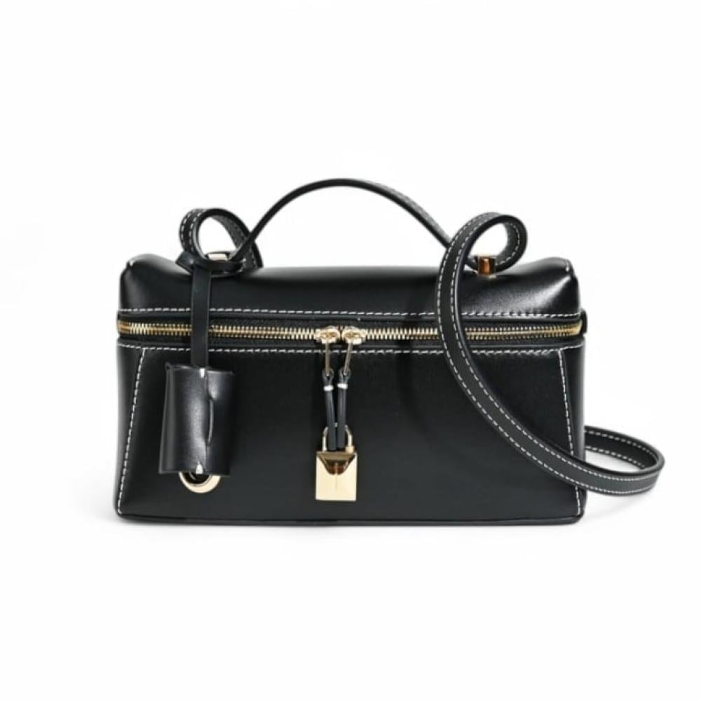 تتميز الحقيبة بتصميم هندسي مستطيل مستوحى من الحقائب الكلاسيكية، مصنوعة من جلد ناعم وعالي الجودة يعكس الحرفية الدقيقة والتفاصيل الراقية التي تميز لوروبيانا اسود.